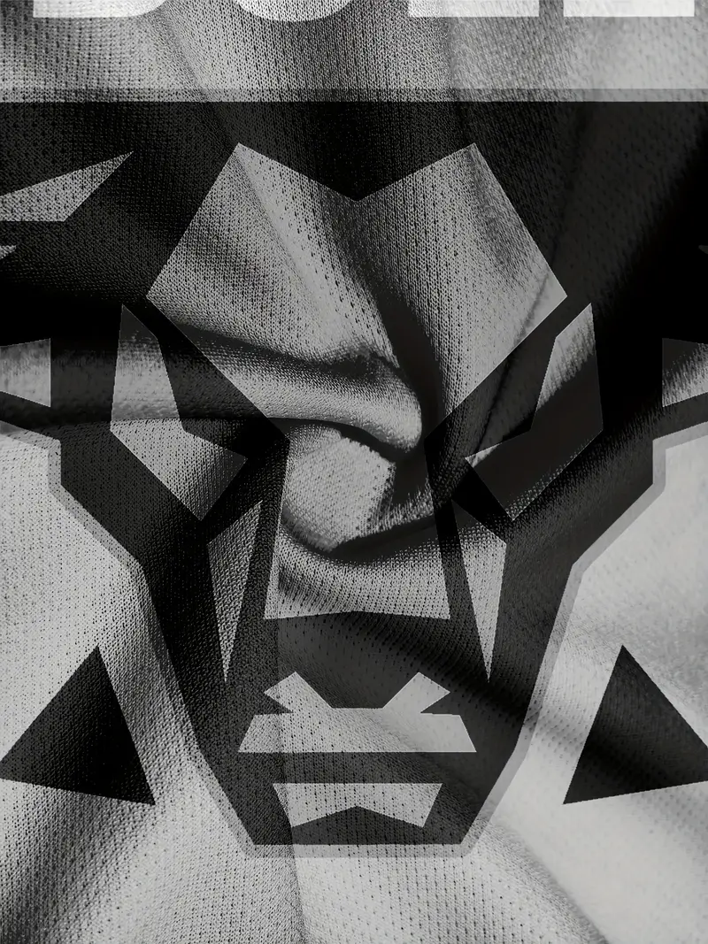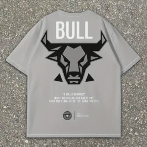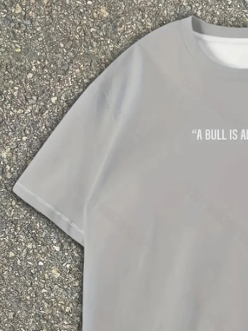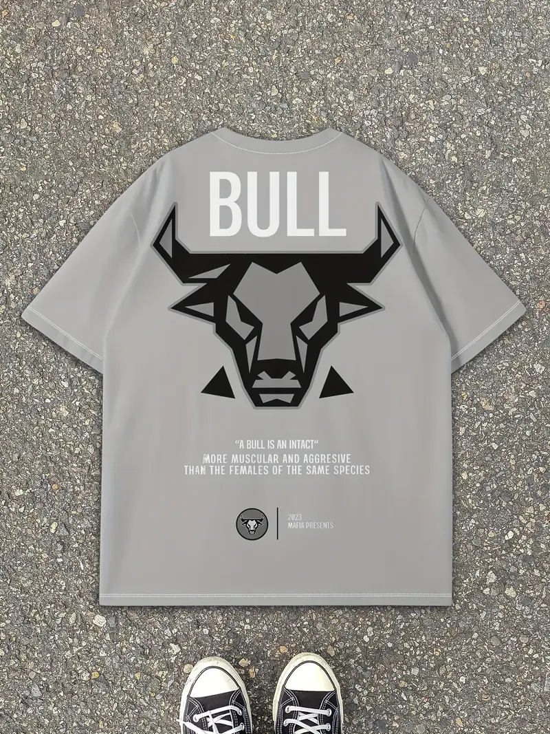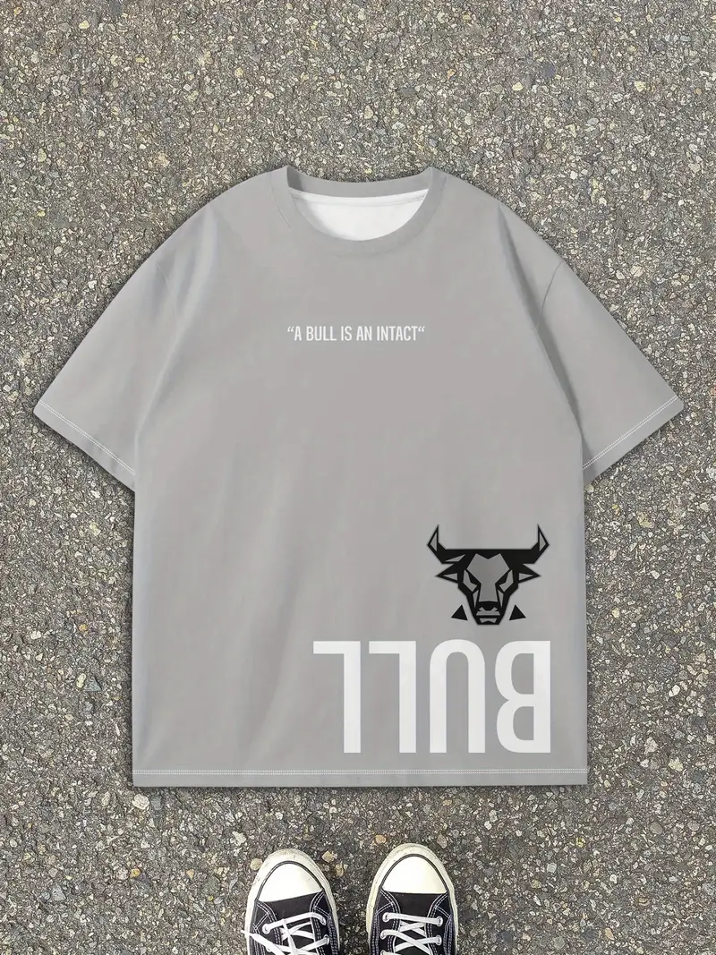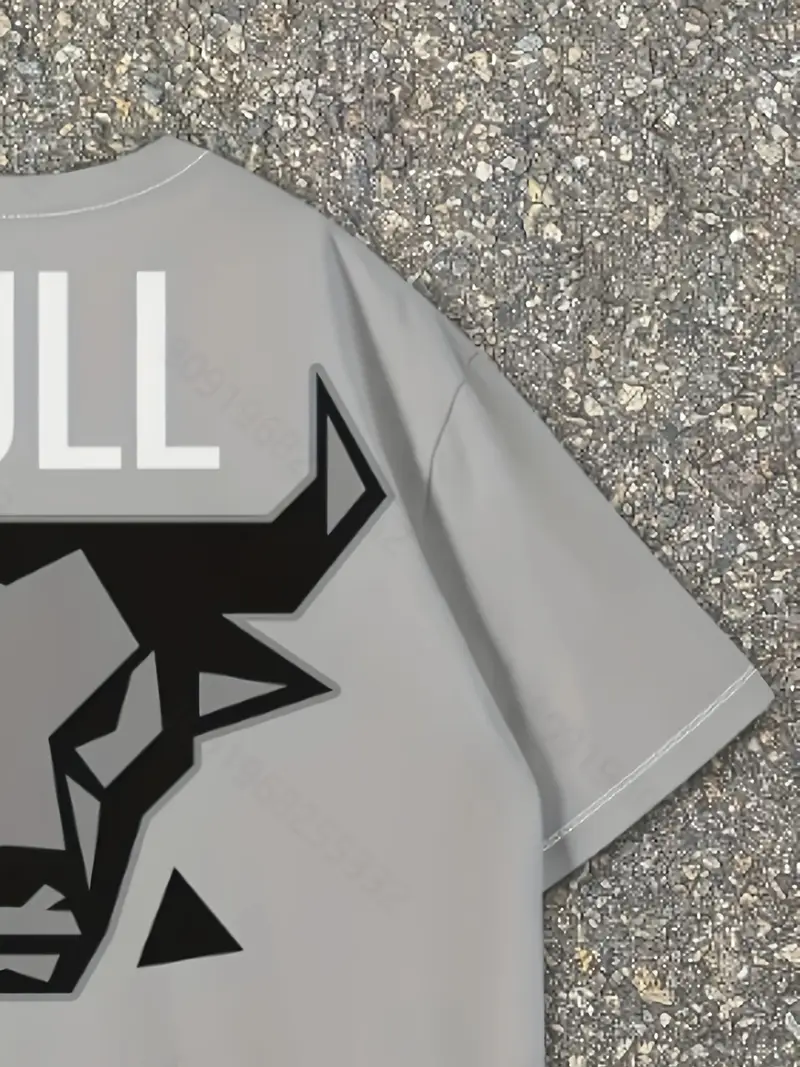 Men’s Casual Crew Neck T-Shirt, 100% Polyester Knit Fabric, Geometric Bull Print, Loose Fit Drop Shoulder Short Sleeve Tee for Indoor & Outdoor Use